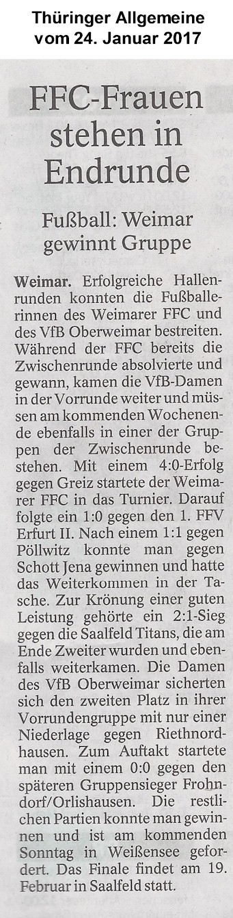 Erster Turniersieg unserer VfB Frauen16.01.2017 Zum 9. Mal fand in Rottleberode der Frauen Luthi- Cup (Freizeit- Futsal- Turnier) statt. Unserer VfB Frauen reisten mit 8 Spielerinnen, davon 6 B- Juniorinnen an. Mit dem Weimarer FFC und SV Allstedt waren zwei Turnier bekannte Mannschaften dabei. Das Niveau der Mannschaften reichte von Kreisliga bis Verbandsliga. ... weiterlesen |