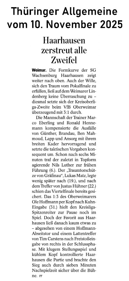 Pokalreise endet - VfB verliert 1:3 gegen Haarhausen08.11.2025 Unsere Erste hatte am Samstag vor zahlreichen Zuschauern erneut die
