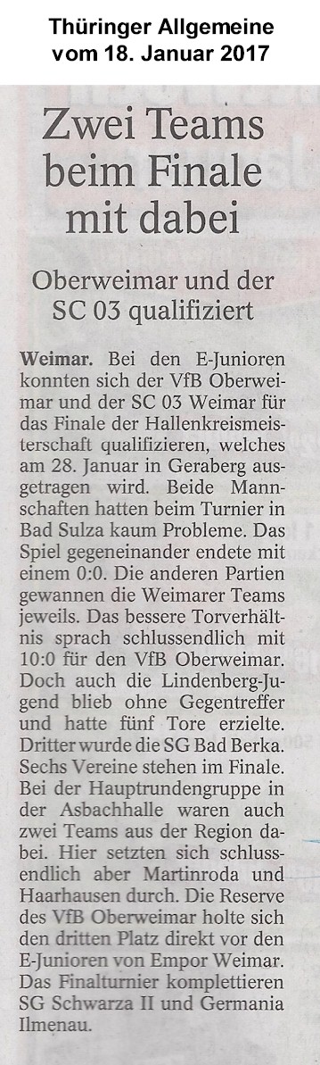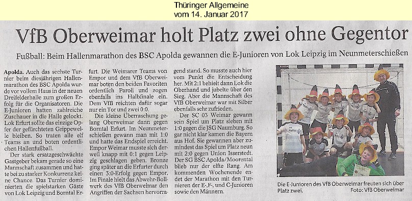 rotieren. VfB Oberweimar E 1 : VfB Oberweimar E 2 4 : 0 Torschützen: 2xThadeus Ramm, Lennard Sohr, Teve Scholwin VfB Oberweimar E 1 : Empor Erfurt 3 : 1 Torschützen: 3 x Thadeus Ramm VfB Oberweimar E1 : Zella Mehlis 5 : 0 Torschützen: Finn Dauke, 2x Teve Scholwin, Bruno Stein, Thadeus Ramm VfB Oberweimar E 1 : Bad Berka 4 : 0 Torschützen: Bruno Stein, 2xThadeus Ramm, Johannes Kuhn VfB Oberweimar E 1 : Tonndorf 1 : 1 Torschütze: Valentin Egerer VfB Oberweimar E 1 : FC Thüringen Jena 2 : 1 Torschützen: Teve Scholwin, Lennard Sohr VfB Oberweimar E 1 : Kölleda 3 : 0 Torschützen: 2x Teve Scholwin, Jakob Simon