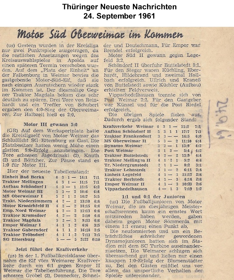 Unsere Pressearchiv: Motor Süd Oberweimar im Kommen (Thüringer Neueste Nachrichten 24.09.1961)