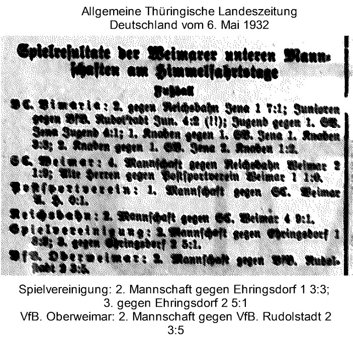 Unsere Pressearchiv: Spielresultate aus Ehringsdorf und Oberweimar (Allgemeine Thüringische Landeszeitung Deutschland 06.05.1932)