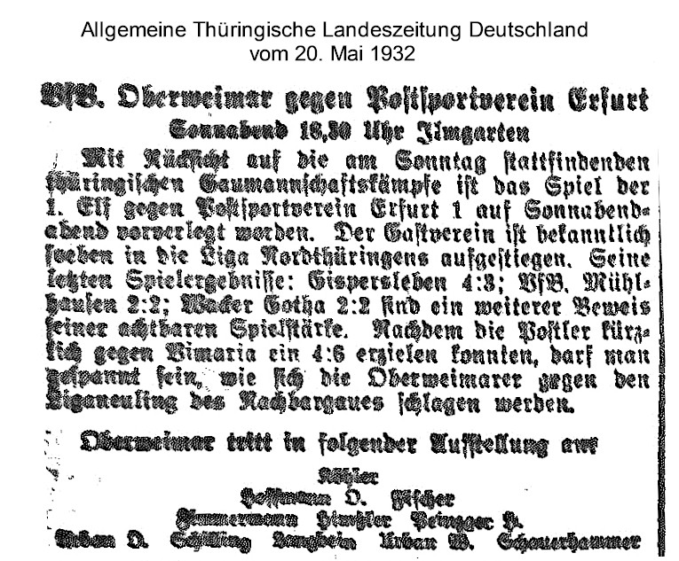 Unsere Pressearchiv: VfB. Oberweimar gegen Postsportverein Erfurt Sonnabend 18:30 Ilmgarten (Allgemeine Thüringische Landeszeitung Deutschland 20.05.1932)