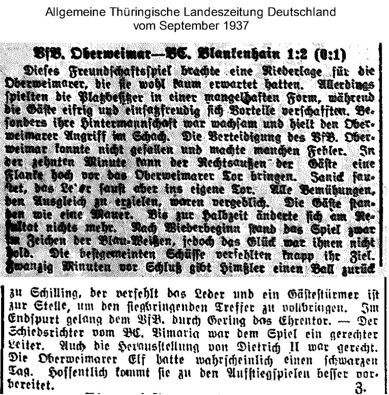 Unsere Pressearchiv: VfB. Oberweimar - SC. Blankenhain 1:2 (Allgemeine Thüringische Landeszeitung Deutschland 01.09.1937)