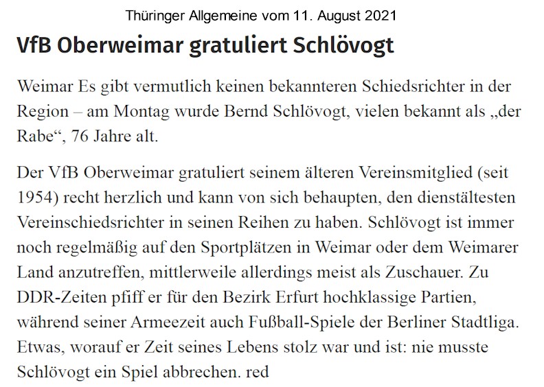 Unsere Pressearchiv: VfB Oberweimar gratuliert Schlövogt (Thüringer Allgemeine 11.08.2021)