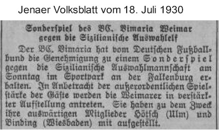 Unsere Pressearchiv: Sonderspiel des BC. Vimaria Weimar gegen die Sizilianische Auswahlelf (Jenaer Volksblatt 18.07.1930)