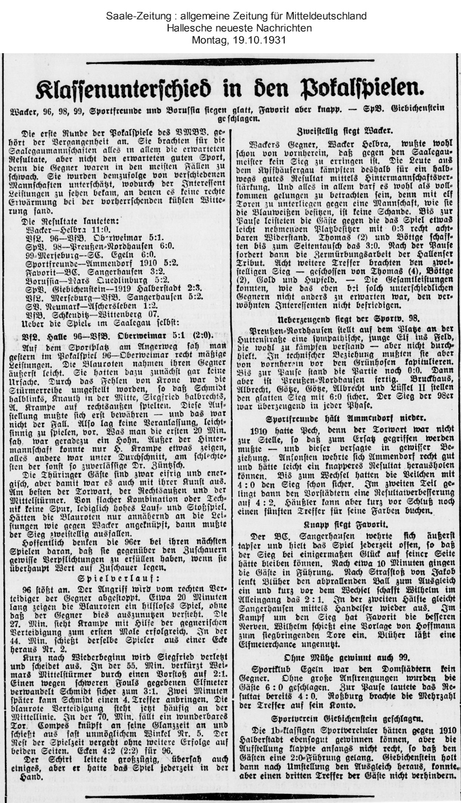 Unsere Pressearchiv: Klassenunterschied in den Pokalspielen (Saale Zeitung 19.10.1931)