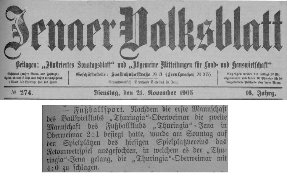 Unsere Pressearchiv: Retourspiel Thuringia Oberweimar gegen Thuringia Jena (Jenaer Volksblatt 21.11.1905)