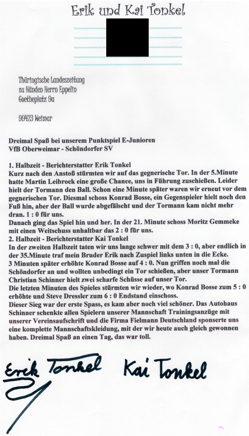 Unsere Pressearchiv: TLZ-Minireporter Kai und Erik Tonkel: Dreimal Spaß gehabt (Thüringische Landeszeitung 02.10.2001)