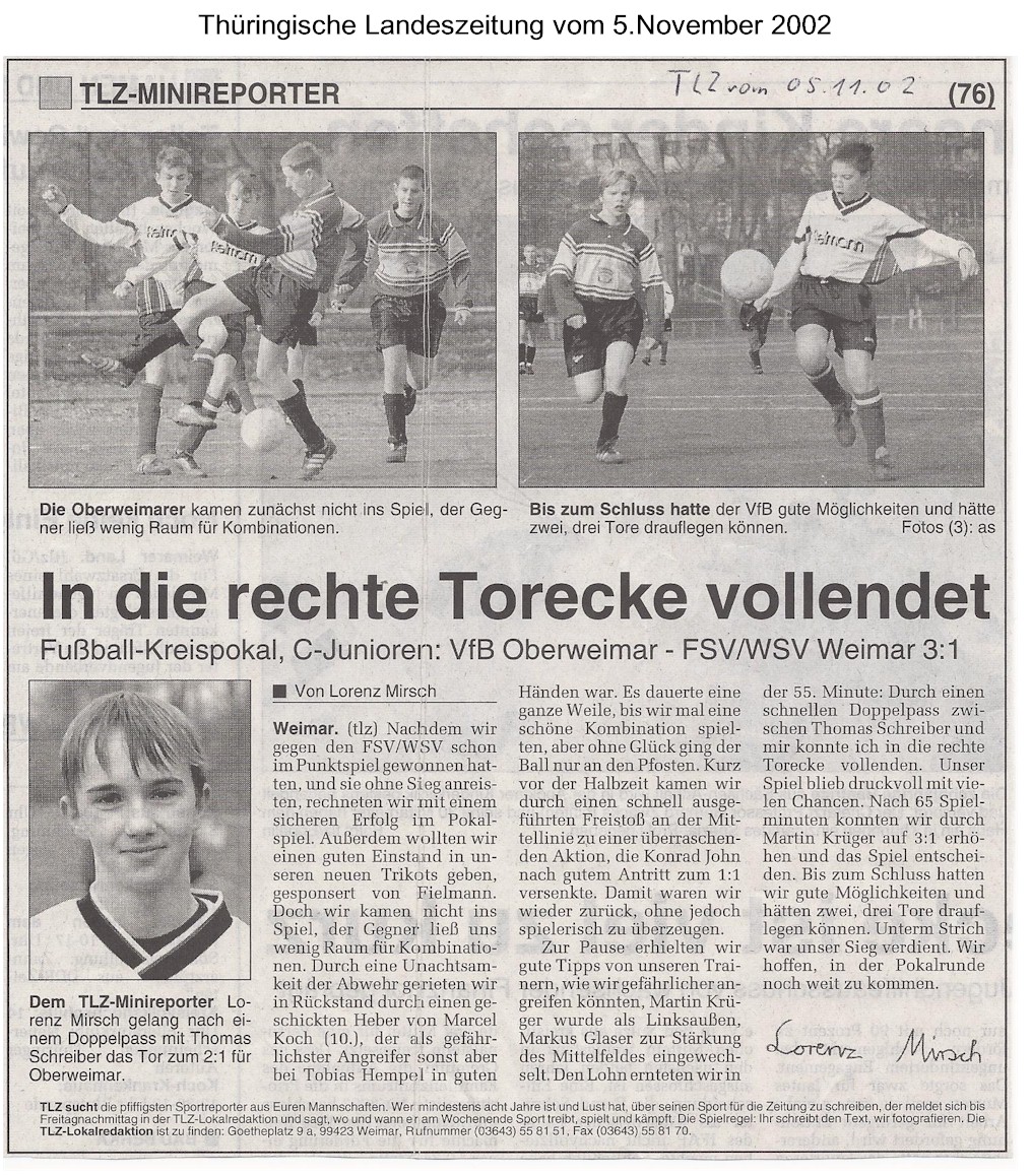 Unsere Pressearchiv: TLZ-Minireporter Lorenz Mirsch: In die rechte Torecke vollendet (Thüringische Landeszeitung 05.11.2002)