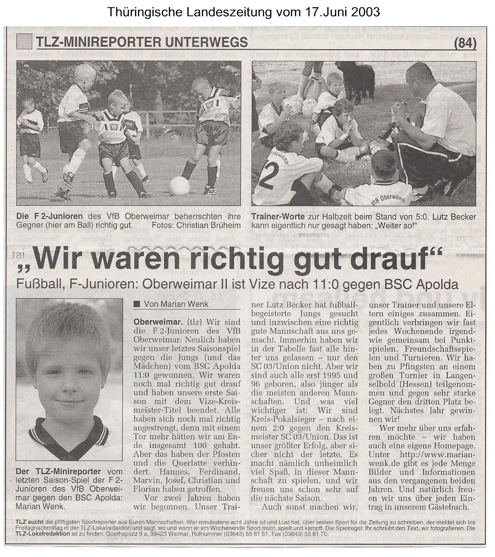 Unsere Pressearchiv: TLZ-Minireporter Marian Wenk: Wir waren richtig gut drauf (Thüringische Landeszeitung 17.06.2003)