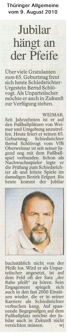 Unsere Pressearchiv: Jubilar häng an der Pfeife (Thüringer Allgemeine 09.08.2010)