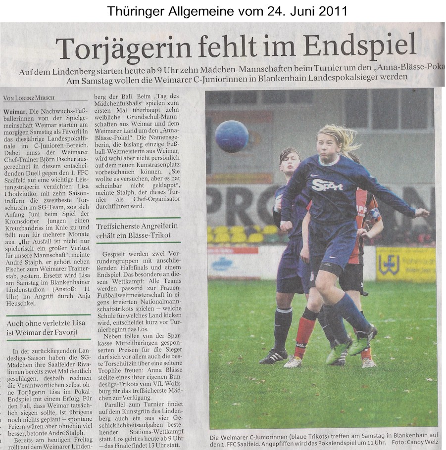 Unsere Pressearchiv: Torjägerin fehlt im Endspiel (Thüringer Allgemeine 24.06.2011)