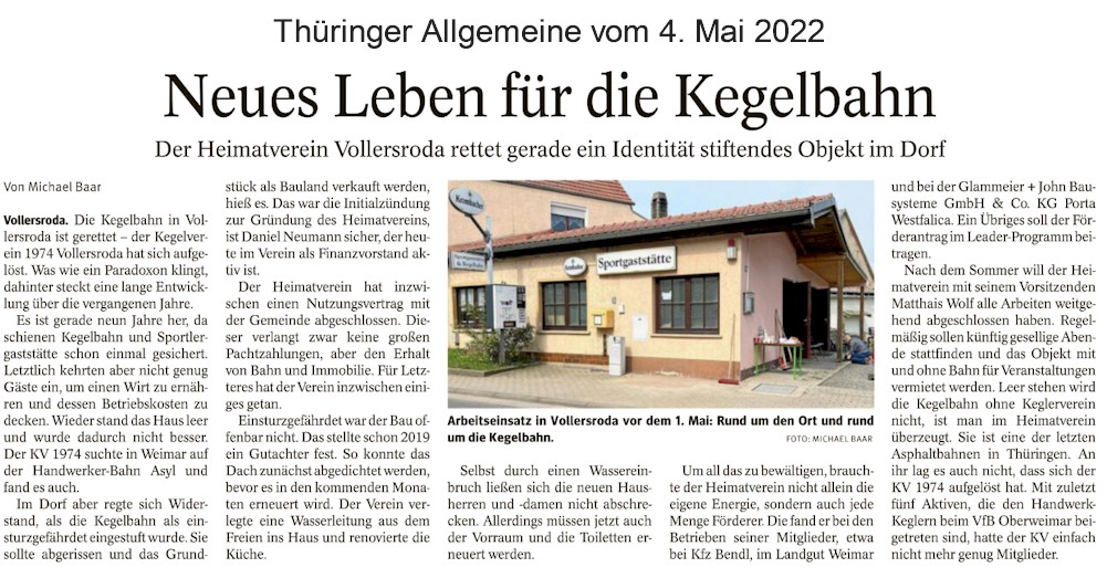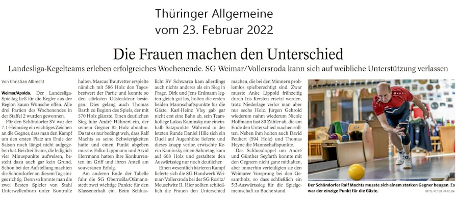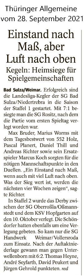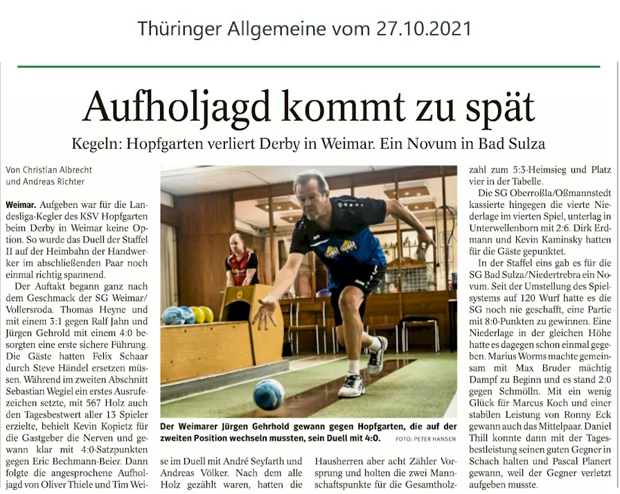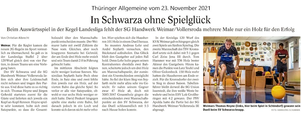Knappe Niederlage in Schwarza23.11.2021 Im Gegensatz zum Wettkampfbetrieb unserer Fußballer haben die Kegler die Saison nicht unterbrochen. Immerhin die Hälfte der Spiele in der Landesliga Männer Staffel II wurden am letzten Wochenende ausgetragen. ... weiterlesen |