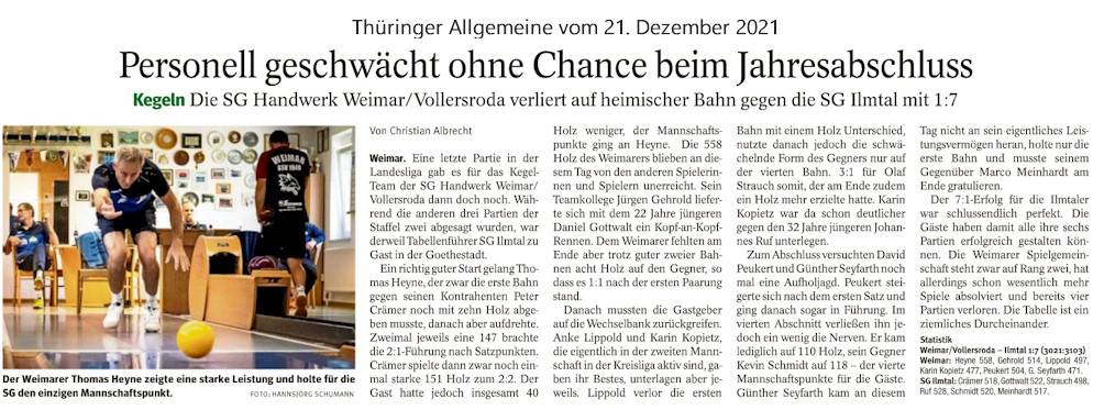 Ohne Chance beim Jahresabschluss23.12.2021 Im Gegensatz zu unseren Fußballern sind unsere Kegler trotz